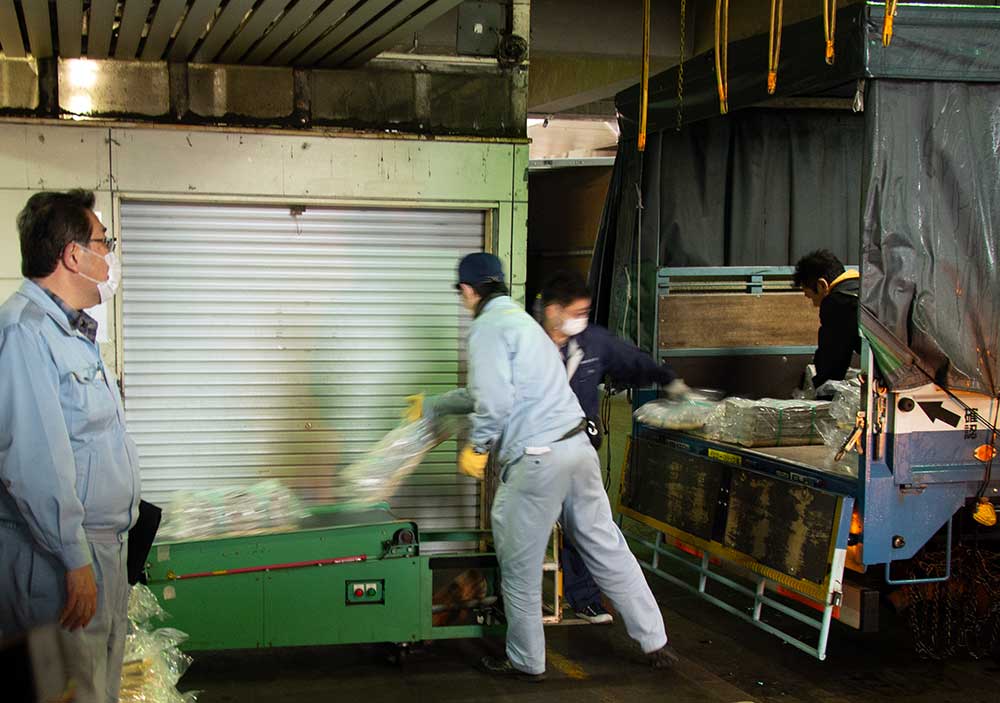 夕刊を積んだトラックがシューターの近くに停まると、すぐに積んできた夕刊をシューターに載せてホームに降ろしていきます。