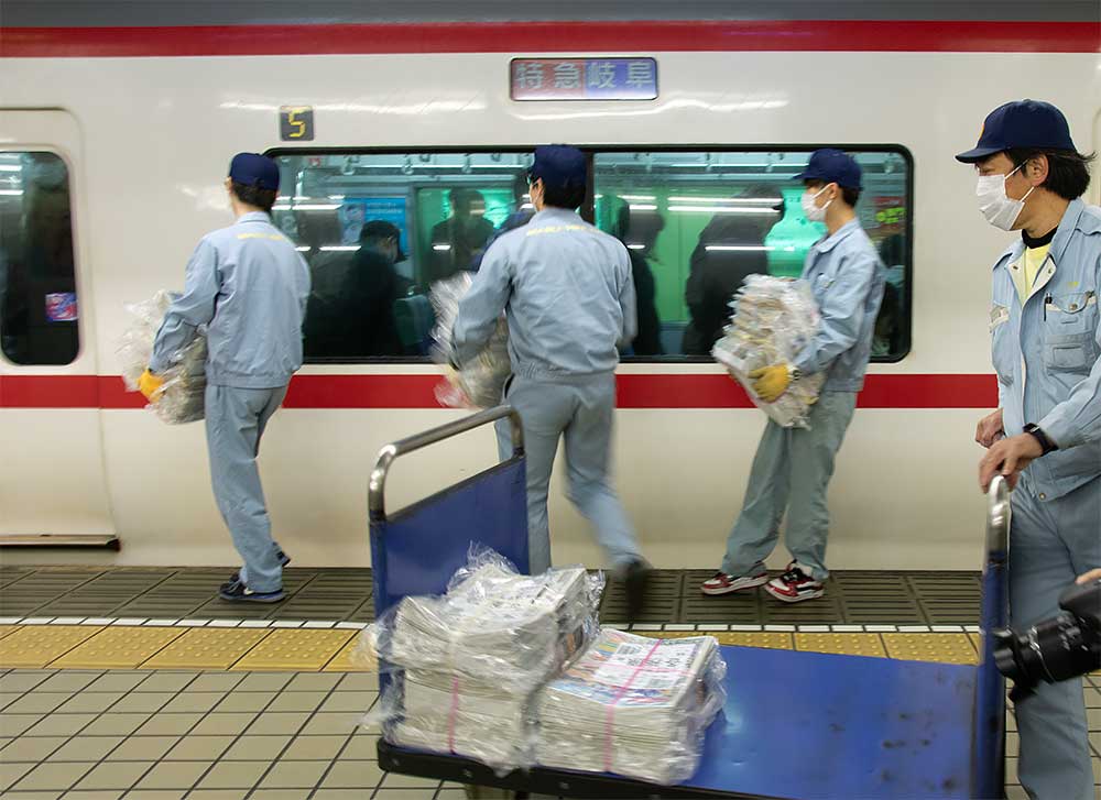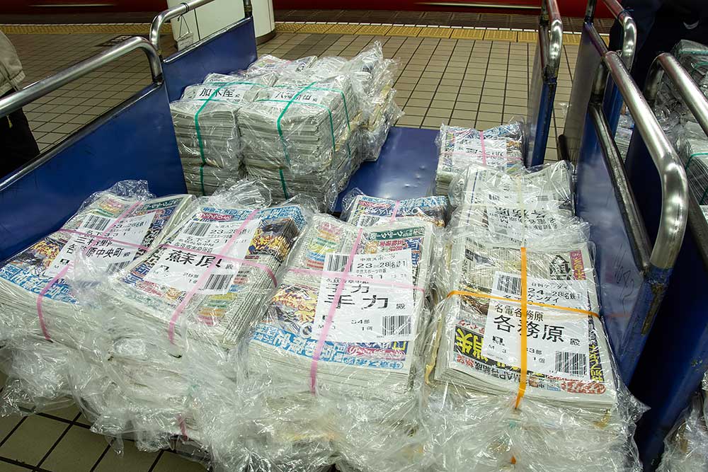 名鉄名古屋駅を午後に利用した際、降車ホームに新聞を積んだ台車が並んでいるところを見た方は少なくないと思います。これらは、方面別に分けられていて、次々にやってくる電車に積み込まれます。
